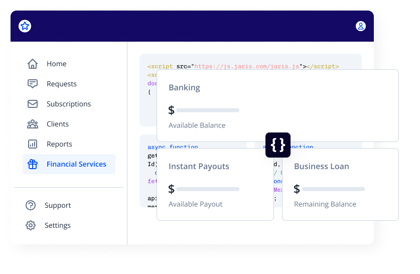 Embed our pre-built Jaris UI with your brand directly into your customer-facing application with 3 lines of Javascript. Don’t have your own merchant portal or POS? We can also provide you with our Merchant Dashboard—a white-labeled hosted instance of Jaris—where your customers can manage their services.